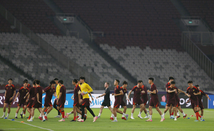 中国国家男子足球队在印度尼西亚雅加达进行赛前训练。新华社发